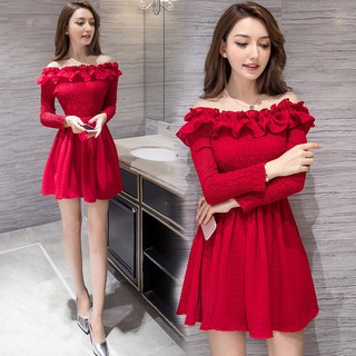 Fashion Sexy Off Shoulder Dress Ruffle Pleated Long Sleeved Red Dress For Dinner Shopee Malaysia